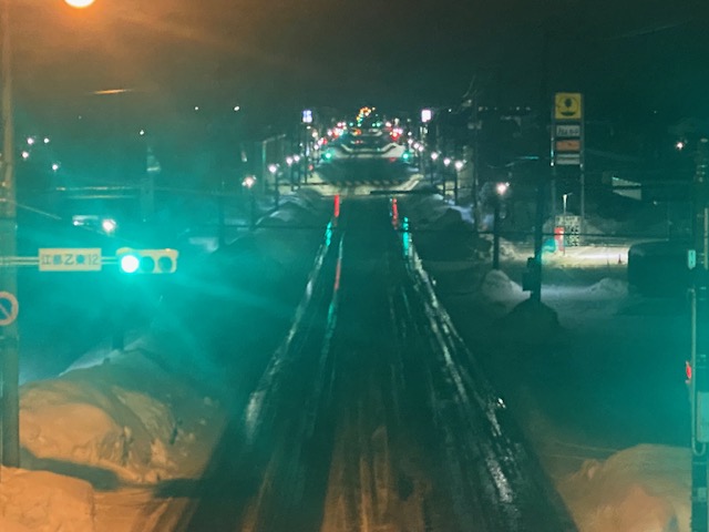 路線は、無くても暖気だったので民間の除雪を行いましたが国道は、道路ベチャベチャでした(道路光っているのは、雪解け水です)